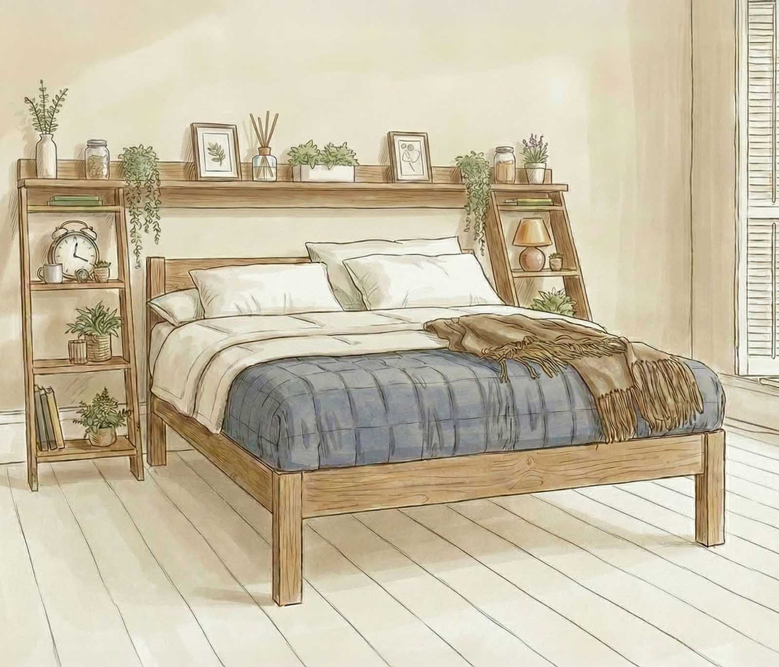 Per mantenere la stanza ariosa e ordinata, l'archiviazione verticale come le mensole a scala o una mensola flottante aiuta a sfruttare al meglio lo spazio della parete. Questi aggiornamenti sono particolarmente efficaci nelle camere da letto più piccole, dove liberare spazio a pavimento può trasformare completamente la sensazione della stanza — con interruzioni minime.